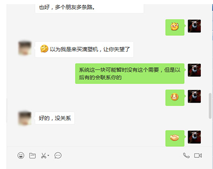 今早,有個客戶微信加到我,而且上面備注道:滴塑機,后來一家這個客戶的微信,這個客戶就直接發:清明節過后我去你們廠內看下設備,一看到消息:心里想到,這個客戶這么直接的嗎?后來我又問道這個客戶是做什么產品的?又給這個客戶發了金裕廠內地址,和一些產品的視頻...結果這個客戶發消息說到,剛剛在接聽電話,不好意思,我們也是做滴塑機系統的,到目前為止已經做了5年了,之前都是做福建這邊的,福建這邊在用我們的比較多,我們的功能跟樂創90%是一樣的,只有一點點不一樣,然后我們的系統會比樂創便宜非常多,就看你們有沒有興趣了解一下,就算生意沒做成,大家碰個面認識一下也好,多個朋友多條路.....以為我是來買滴塑機,讓你失望了。看到這里,原來不是客戶啊,隨后有跟這個客戶聊了一會,問到這個客戶是從哪里聯系到我這的,客戶說到:你們廣告做得很到位,在百度上找的的....果然金裕從哪方面來講都是很棒的!