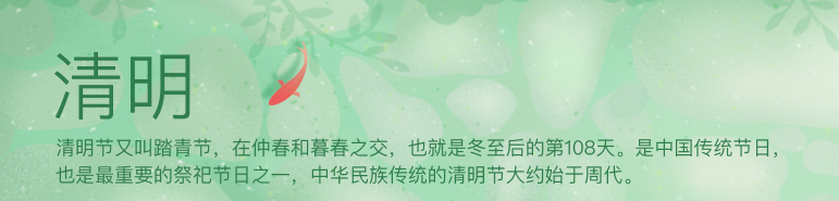 在我國的傳統(tǒng)中,清明踏青的內(nèi)在意義還在于順應(yīng)時令節(jié)氣。陽春三月,生氣始盛,人們走出屋門,來到野外,主動地迎合時氣,促進(jìn)自身體內(nèi)的陽氣流轉(zhuǎn),對身體大有裨益。 清明節(jié)又叫踏青節(jié),在仲春與暮春之交,也就是冬至后的第104天。是中國傳統(tǒng)節(jié)日,也是最重要的祭祀節(jié)日之一,是祭祖和掃墓的日子中華民族傳統(tǒng)的清明節(jié)大約始于周代,距今已有二千五百多年的歷史。