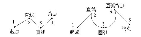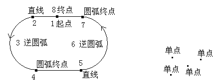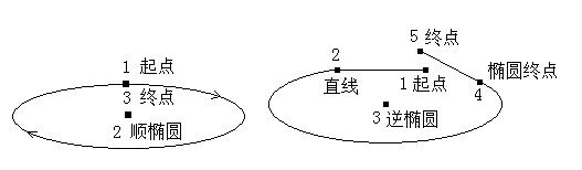 順圓弧”、“逆圓弧”、“圓弧”、“整圓”、“圓”、“逆橢圓”這些指令不能單獨存在,必須與前一點和后一點組合才能形成一個圖形。