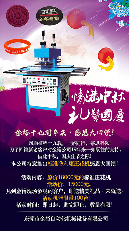 風雨征程十九載,一路同行,感恩有你!為了回饋新老客戶對金裕公司19年來一如既往的支持借此中秋,國慶佳節之際!金裕公司為答謝新老客戶對公司的大力支持,本公司特意推出標準矽利康壓花機感恩大回饋!量100臺,售完恢復原價,有需要的客戶朋友抓緊了~,咨詢熱線:13826974368 汪女士 金裕自金裕公司研發,生產,銷售矽利康植膠機已有19年,產品銷印度,巴基斯坦,墨西哥,南美,德國,意大利等多個國家和地區金裕也在不斷改進和研發新的壓花設備,堅持走技術領先,努力打造具有自主知識產權的核心產品。目前金裕銷售的矽利康植膠機有:標準雙頭矽利康植膠機,帶冷凍臺矽利康植膠機,成品衣矽利康植膠機,旋轉滑臺矽利康植膠機,全自動矽利康植膠機及硅膠壓花整套設備。公司同時提供原材料供應渠道和生產技術支持 東莞市金裕自動化機械設備有限公司成立于2000年,金裕坐落于東莞市大嶺山向東工業區,創辦硅膠、PVC商標禮品生產設備.金裕研發的全自動全自動點膠機、矽膠機、油壓機、KPU鞋材機以及終于實現了的智能無人車間生產流水線,金裕的自動化設備可以做到讓你省人、省電、省管理。金裕公司歡迎新老來訪,選擇金裕,沒有顧慮。m.touristlink.com.cn |