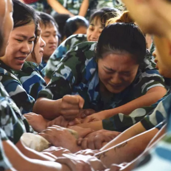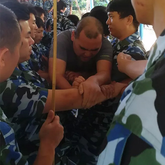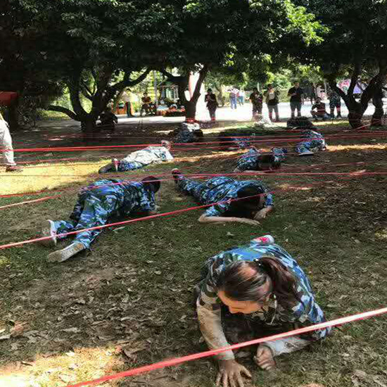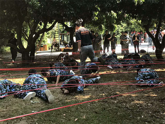 第二個(gè)項(xiàng)目是“人間煉獄”,分別由兩個(gè)人雙手和對方緊緊握住,形成一條人工長梯,然后每個(gè)人都要從上面爬行通過。這個(gè)活動給我的感觸最深,當(dāng)自己的手握住隊(duì)友的手向前攀爬時(shí),感受到滿滿的溫暖和力量,隊(duì)友們承載的是支持和痛苦。當(dāng)自己快爬不動的時(shí)候,看著周圍兩行齊刷刷鼓勵(lì)的眼神,想著自己多停頓一會,就會給隊(duì)友多帶去一絲痛苦,咬緊牙關(guān)繼續(xù)前行。隊(duì)友中還有55歲的公司老板,可是他絲毫沒有因?yàn)樽约旱奶厥猓痛蠹乙粯优Γ瑘?jiān)持到終點(diǎn)。最后每個(gè)人都順利通過考驗(yàn)。