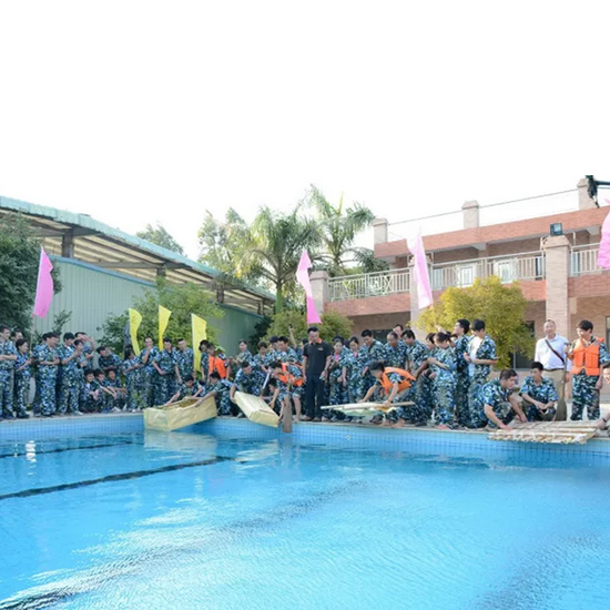 第三個(gè)項(xiàng)目是人造紙船,造好的船由一個(gè)重量120斤的學(xué)員坐上船劃過游泳池。大家集思廣益,你一言,我一語,充分發(fā)輝每個(gè)人的想象力和創(chuàng)造力。造出來的船款式多樣,各有特色。比賽開始后,有的一路順暢,安全劃到終點(diǎn),有的在水中劃行一段后,紙進(jìn)水被打濕,隊(duì)員被泡在水里。人在船在,在大家的加油聲中,學(xué)員拖著紙船,努力游向終點(diǎn)。相信經(jīng)過這次失敗,如果再造船的話都會成功。這個(gè)游戲告訴我們,要發(fā)揚(yáng)團(tuán)隊(duì)開拓精神,勇于創(chuàng)新,敢于嘗試。就算是失敗,我們也可以從中收獲很多經(jīng)驗(yàn)和不足,為以后的成功奠定基礎(chǔ)。