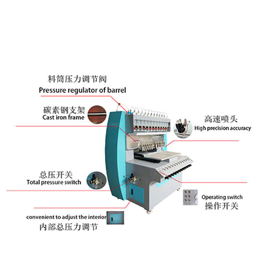 1.機架采用鋼板焊接成型一體加工而成 , 穩定抗震、不易變形 。2.采用直線導軌控制點膠閥左右滑動、打膠穩定、無氣泡、漏膠現象。3.工作臺帶有加熱功能,有效促進產品流動性能 。4.機器帶有自動清洗閥裝置,節省時間人力成本 。5.三軸坐標系統控制,精度可達 0.01mm 。6.金裕點膠機有8色/12色/24色可選,用戶可根據自己需求選擇,單個產品顏色較少的產品,2-3色建議選擇8色配置,4色以上量產產品建議選擇12色配置,還可以根據客戶需求特殊定制。