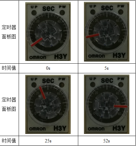 雙工位水冷烤模臺旋鈕式定時器 安裝在烤模臺電箱內部的旋鈕式定時器是用于設定烤模臺的排水時間,當按下啟動按鈕之后,定時器開始計時,當計時時間與設定的時間相同時,水閥會打開排水,降低水位。該定時器設定值范圍為0~60秒。 下面列舉了烤模臺幾種不同時間值及相應的定時器面板圖。
