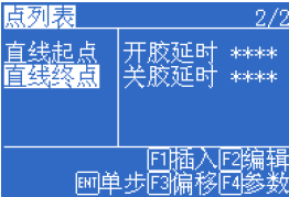 編輯點的參數。對于一段圖形。起點有開膠延時、速度參數,直線中點有速度參數(運動中變速),終點有關膠延時、拉絲高度、上抬高度參數。這些參數都只對這段圖形生效。