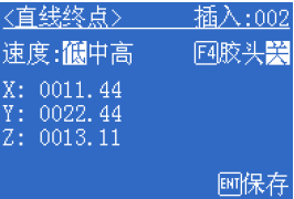 插入直線起點 經過點動,針頭運動到模具的合適位置后,按下[ENT]保存。此時直線起點就示教好了。然后示教盒又會自動進入直線終點的插入界面,如圖 點動到合適位置后,按下[ENT]保存。直線就示教完了。此時示教盒又回到 點列表界面。 東莞市金裕自動化機械設備有限公司成立于2000年,金裕坐落于東莞市大嶺山向東工業區,創辦硅膠、PVC商標禮品生產設備.金裕研發的全自動全自動點膠機、矽膠機、油壓機、KPU鞋材機以及終于實現了的智能無人車間生產流水線,金裕的自動化設備可以做到讓你省人、省電、省管理。金裕公司歡迎新老來訪,選擇金裕,沒有顧慮。m.touristlink.com.cn |