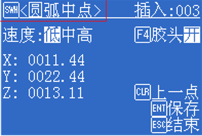 插入多段線-第2點 點動到合適位置后,按[ENT]保存。示教盒跳入示教第3點的界面中。第3點要求是點類型是圓弧中點。注意到在插入多段線時,點類型前有[SWH]按鈕,按下[SWH]可切換當前點類型。如圖3-23所示。
