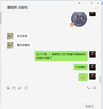 剛剛微信上有位譚先生加我微信,備注上打的是咨詢點膠機,然后我就添加同意了。問到這個客戶是咨詢8色點膠機呢?還是12色點膠機呢?這個客戶說8色的吧,顏色不是很多,后來這個客戶又說到12色的點膠機,咨詢一詢問,這個客戶是做pvc產品,不過是第一次接觸,然后客戶就問到,你們師傅會過來教嗎?我:有的,最好是到我們廠內學,是最方便的,當然我們的師傅也可以過去,但要提供師傅住食宿的問題。后面就給這個客戶發了幾個pvc產品的視頻,過來一會這個客戶又問道:學pvc產品大概需要多久的時間,我打趣著說,這個要看你領悟的程度了,一般是3-5天,然后客戶特別可愛的問答,要交學費嗎?哈哈我立馬回復到:不用不用的,免費的....后來客戶有回復我到:過幾天去的話給你消息..![]() 東莞市金裕自動化機械設備有限公司成立于2000年,金裕坐落于東莞市大嶺山向東工業區,創辦硅膠、PVC商標禮品生產設備.金裕研發的全自動全自動點膠機、矽膠機、油壓機、KPU鞋材機以及終于實現了的智能無人車間生產流水線,金裕的自動化設備可以做到讓你省人、省電、省管理。金裕公司歡迎新老顧客來訪,選擇金裕,沒有顧慮。m.touristlink.com.cn |