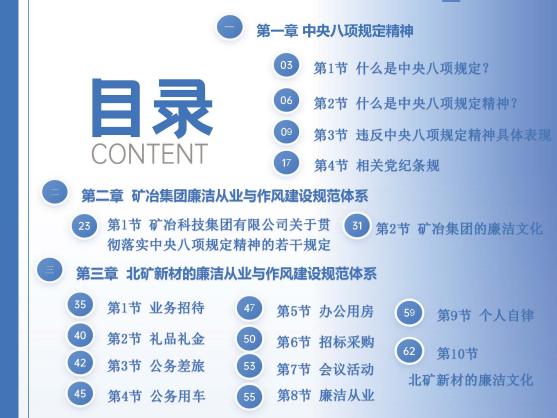 公司紀(jì)委辦公室牽頭,廣泛發(fā)動黨員員工收集廉潔格言警句,系統(tǒng)編撰《廉潔文化手冊》。手冊(總計68頁)匯集了中央八項規(guī)定精神解讀、礦冶集團(tuán)廉潔從業(yè)規(guī)范、北礦新材相關(guān)制度條款摘編及公司提煉的廉潔文化核心內(nèi)容,創(chuàng)新地將招標(biāo)采購、業(yè)務(wù)招待、資金管理等高風(fēng)險領(lǐng)域制度條款可視化呈現(xiàn),打造成為黨員干部隨身攜帶的廉潔“口袋書”。